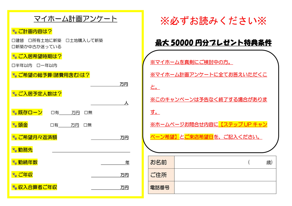 問合せフォームに【ステップUPキャンペーン ご来店希望日】をご記入ください。